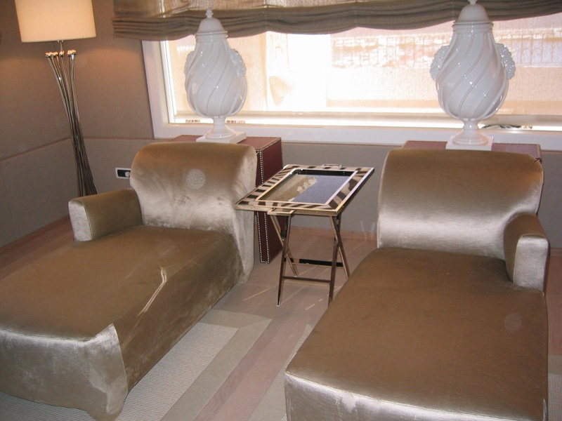 Рядом с диваномнапереднемплане, столик UITILEизникелированнойлатуни; наконсолидванатуральныхкоралланаметаллическомкубе, установленнымнадеревяннуюоснову. Побокамкреселдваметаллическихторшера Piovra изникелированнойлатуни, с льнянымабажуромцветаслоновойкости; в серединеподнос с металлическимиручками ивставкамиизмехазебры.
